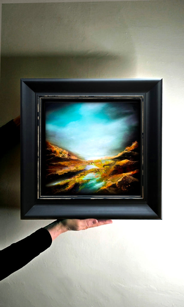 Medium: Gold-leaf, inks, impasto and glazes on canvas - classic antiqued black & gold-frame, deep profile.